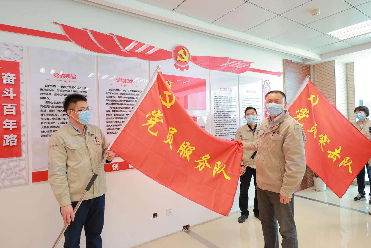 為第一黨支部黨員突擊隊(duì)、黨員服務(wù)隊(duì)授旗(林以恒/攝)