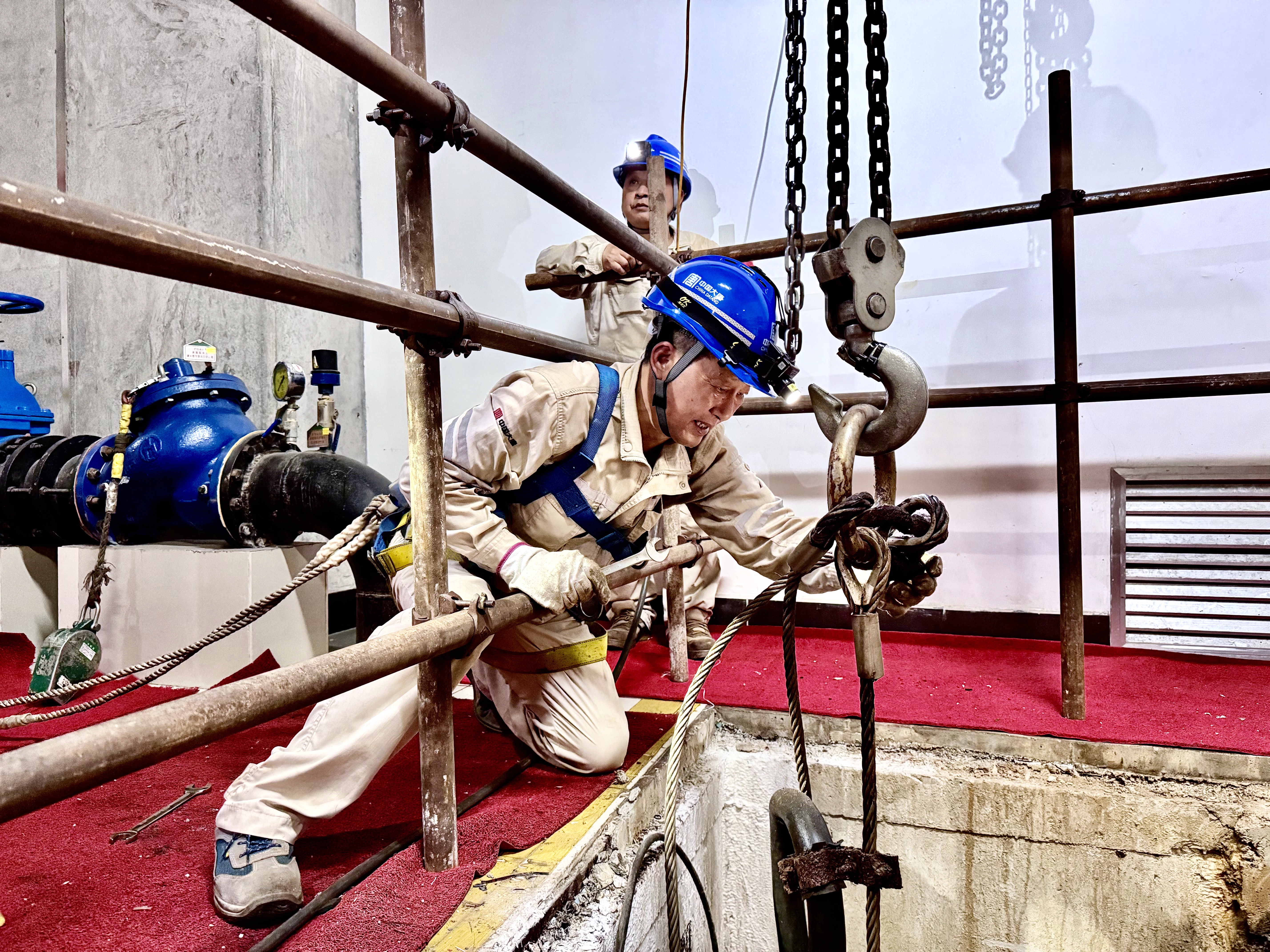 方案既定,張靈波再次探身幽井,汗珠砸在冰冷鋼索上。他艱難操控導(dǎo)鏈,試圖提起鋼絲繩以便卡新扣。井壁濕滑,空間逼仄,每一寸調(diào)整都耗盡心力。